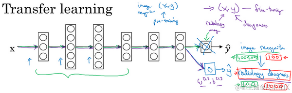 具体来说,在第一阶段训练过程中,当你进行图像识别任务训练时,你可以训练神经网络的所有常用参数,所有的权重,所有的层,然后你就得到了一个能够做图像识别预测的网络。在训练了这个神经网络后,要实现迁移学习,你现在要做的是,把数据集换成新的 对,现在这些变成放射科图像,而 是你想要预测的诊断,你要做的是初始化最后一层的权重,让我们称之为 和 随机初始化。
