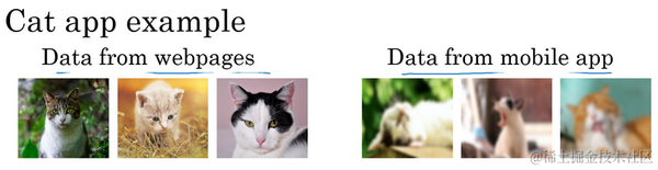 假设你在开发一个手机应用,用户会上传他们用手机拍摄的照片,你想识别用户从应用中上传的图片是不是猫。现在你有两个数据来源,一个是你真正关心的数据分布,来自应用上传的数据,比如右边的应用,这些照片一般更业余,取景不太好,有些甚至很模糊,因为它们都是业余用户拍的。另一个数据来源就是你可以用爬虫程序挖掘网页直接下载,就这个样本而言,可以下载很多取景专业、高分辨率、拍摄专业的猫图片。如果你的应用用户数还不多,也许你只收集到10,000张用户上传的照片,但通过爬虫挖掘网页,你可以下载到海量猫图,也许你从互联网上下载了超过20万张猫图。而你真正关心的算法表现是你的最终系统处理来自应用程序的这个图片分布时效果好不好,因为最后你的用户会上传类似右边这些图片,你的分类器必须在这个任务中表现良好。现在你就陷入困境了,因为你有一个相对小的数据集,只有10,000个样本来自那个分布,而你还有一个大得多的数据集来自另一个分布,图片的外观和你真正想要处理的并不一样。但你又不想直接用这10,000张图片,因为这样你的训练集就太小了,使用这20万张图片似乎有帮助。但是,困境在于,这20万张图片并不完全来自你想要的分布,那么你可以怎么做呢?
