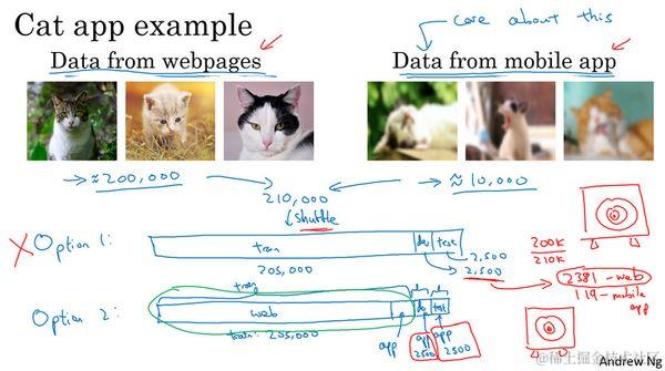 所以结果你的数据总量,这200,000个样本,我就用 缩写表示,我把那些是从网页下载的数据总量写成 ,所以对于这2500个样本,数学期望值是: ,有2381张图来自网页下载,这是期望值,确切数目会变化,取决于具体的随机分配操作。但平均而言,只有119张图来自手机上传。要记住,设立开发集的目的是告诉你的团队去瞄准的目标,而你瞄准目标的方式,你的大部分精力都用在优化来自网页下载的图片,这其实不是你想要的。所以我真的不建议使用第一个选项,因为这样设立开发集就是告诉你的团队,针对不同于你实际关心的数据分布去优化,所以不要这么做。