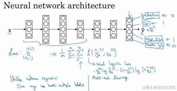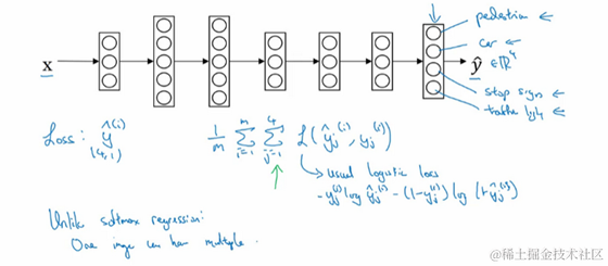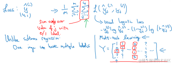 整个训练集的平均损失和之前分类猫的例子主要区别在于,现在你要对 到4求和,这与softmax回归的主要区别在于,与softmax回归不同,softmax将单个标签分配给单个样本。