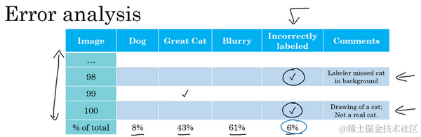 我知道在机器学习中,有时候我们很鄙视手工操作,或者使用了太多人为数值。但如果你要搭建应用系统,那这个简单的人工统计步骤,错误分析,可以节省大量时间,可以迅速决定什么是最重要的,或者最有希望的方向。实际上,如果你观察100个错误标记的开发集样本,也许只需要5到10分钟的时间,亲自看看这100个样本,并亲自统计一下有多少是狗。根据结果,看看有没有占到5%、50%或者其他东西。这个在5到10分钟之内就能给你估计这个方向有多少价值,并且可以帮助你做出更好的决定,是不是把未来几个月的时间投入到解决错误标记的狗图这个问题。