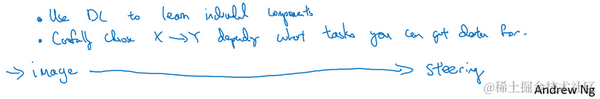 所以这个例子就表明了,如果你想使用机器学习或者深度学习来学习某些单独的组件,那么当你应用监督学习时,你应该仔细选择要学习的 到 映射类型,这取决于那些任务你可以收集数据。相比之下,谈论纯端到端深度学习方法是很激动人心的,你输入图像,直接得出方向盘转角,但是就目前能收集到的数据而言,还有我们今天能够用神经网络学习的数据类型而言,这实际上不是最有希望的方法,或者说这个方法并不是团队想出的最好用的方法。而我认为这种纯粹的端到端深度学习方法,其实前景不如这样更复杂的多步方法。因为目前能收集到的数据,还有我们现在训练神经网络的能力是有局限的。