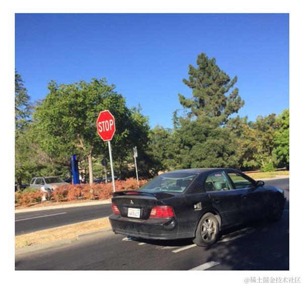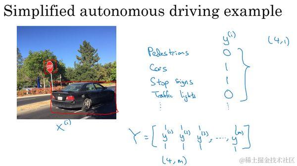 我们来看一个例子,假设你在研发无人驾驶车辆,那么你的无人驾驶车可能需要同时检测不同的物体,比如检测行人、车辆、停车标志,还有交通灯各种其他东西。比如在左边这个例子中,图像里有个停车标志,然后图像中有辆车,但没有行人,也没有交通灯。