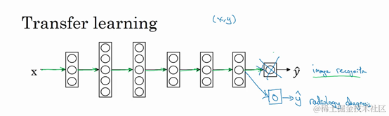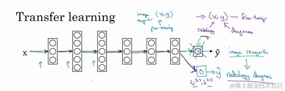 我们来看看,假设你已经训练好一个图像识别神经网络,所以你首先用一个神经网络,并在 对上训练,其中 是图像, 是某些对象,图像是猫、狗、鸟或其他东西。如果你把这个神经网络拿来,然后让它适应或者说迁移,在不同任务中学到的知识,比如放射科诊断,就是说阅读 射线扫描图。你可以做的是把神经网络最后的输出层拿走,就把它删掉,还有进入到最后一层的权重删掉,然后为最后一层重新赋予随机权重,然后让它在放射诊断数据上训练。