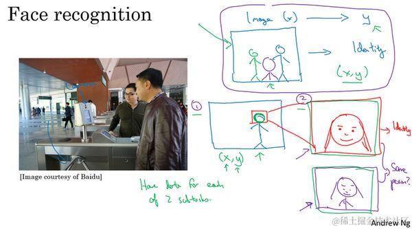 为什么两步法更好呢?实际上有两个原因。一是,你解决的两个问题,每个问题实际上要简单得多。但第二,两个子任务的训练数据都很多。具体来说,有很多数据可以用于人脸识别训练,对于这里的任务1来说,任务就是观察一张图,找出人脸所在的位置,把人脸图像框出来,所以有很多数据,有很多标签数据 ,其中 是图片, 是表示人脸的位置,你可以建立一个神经网络,可以很好地处理任务1。然后任务2,也有很多数据可用,今天,业界领先的公司拥有,比如说数百万张人脸照片,所以输入一张裁剪得很紧凑的照片,比如这张红色照片,下面这个,今天业界领先的人脸识别团队有至少数亿的图像,他们可以用来观察两张图片,并试图判断照片里人的身份,确定是否同一个人,所以任务2还有很多数据。相比之下,如果你想一步到位,这样 的数据对就少得多,其中 是门禁系统拍摄的图像, 是那人的身份,因为你没有足够多的数据去解决这个端到端学习问题,但你却有足够多的数据来解决子问题1和子问题2。