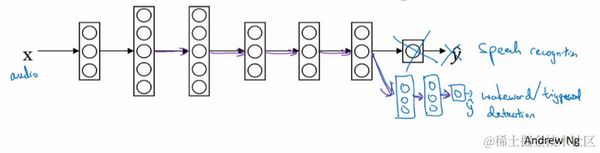 这里是另一个例子,假设你已经训练出一个语音识别系统,现在 是音频或音频片段输入,而 是听写文本,所以你已经训练了语音识别系统,让它输出听写文本。现在我们说你想搭建一个“唤醒词”或“触发词”检测系统,所谓唤醒词或触发词就是我们说的一句话,可以唤醒家里的语音控制设备,比如你说“Alexa”可以唤醒一个亚马逊Echo设备,或用“OK Google”来唤醒Google设备,用"Hey Siri"来唤醒苹果设备,用"你好百度"唤醒一个百度设备。要做到这点,你可能需要去掉神经网络的最后一层,然后加入新的输出节点,但有时你可以不只加入一个新节点,或者甚至往你的神经网络加入几个新层,然后把唤醒词检测问题的标签 喂进去训练。再次,这取决于你有多少数据,你可能只需要重新训练网络的新层,也许你需要重新训练神经网络中更多的层。