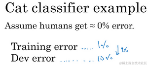 我们继续用猫分类器为例,我们说人类在这个任务上能做到几乎完美,所以贝叶斯错误率或者说贝叶斯最优错误率,我们知道这个问题里几乎是0%。所以要进行错误率分析,你通常需要看训练误差,也要看看开发集的误差。比如说,在这个样本中,你的训练集误差是1%,你的开发集误差是10%,如果你的开发集来自和训练集一样的分布,你可能会说,这里存在很大的方差问题,你的算法不能很好的从训练集出发泛化,它处理训练集很好,但处理开发集就突然间效果很差了。