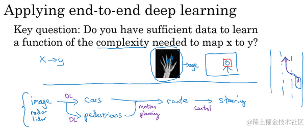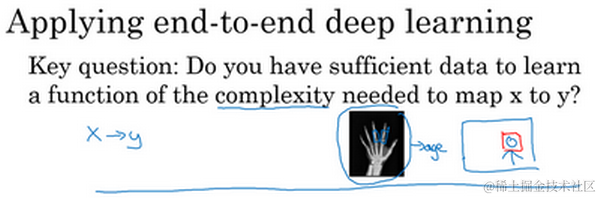 如果你在构建一个新的机器学习系统,而你在尝试决定是否使用端到端深度学习,我认为关键的问题是,你有足够的数据能够直接学到从 映射到 足够复杂的函数吗?我还没有正式定义过这个词“必要复杂度(complexity needed)”。但直觉上,如果你想从 到 的数据学习出一个函数,就是看着这样的图像识别出图像中所有骨头的位置,那么也许这像是识别图中骨头这样相对简单的问题,也许系统不需要那么多数据来学会处理这个任务。或给出一张人物照片,也许在图中把人脸找出来不是什么难事,所以你也许不需要太多数据去找到人脸,或者至少你可以找到足够数据去解决这个问题。相对来说,把手的X射线照片直接映射到孩子的年龄,直接去找这种函数,直觉上似乎是更为复杂的问题。如果你用纯端到端方法,需要很多数据去学习。
