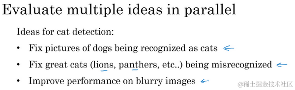 在本幻灯片中,我们要描述一下如何使用错误分析来评估某个想法,这个样本里狗的问题是否值得解决。有时你在做错误分析时,也可以同时并行评估几个想法,比如,你有几个改善猫检测器的想法,也许你可以改善针对狗图的性能,或者有时候要注意,那些猫科动物,如狮子,豹,猎豹等等,它们经常被分类成小猫或者家猫,所以你也许可以想办法解决这个错误。或者也许你发现有些图像是模糊的,如果你能设计出一些系统,能够更好地处理模糊图像。也许你有些想法,知道大概怎么处理这些问题,要进行错误分析来评估这三个想法。