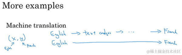 我们再来看几个例子,比如机器翻译。传统上,机器翻译系统也有一个很复杂的流水线,比如英语机翻得到文本,然后做文本分析,基本上要从文本中提取一些特征之类的,经过很多步骤,你最后会将英文文本翻译成法文。因为对于机器翻译来说的确有很多(英文,法文)的数据对,端到端深度学习在机器翻译领域非常好用,那是因为在今天可以收集 对的大数据集,就是英文句子和对应的法语翻译。所以在这个例子中,端到端深度学习效果很好。