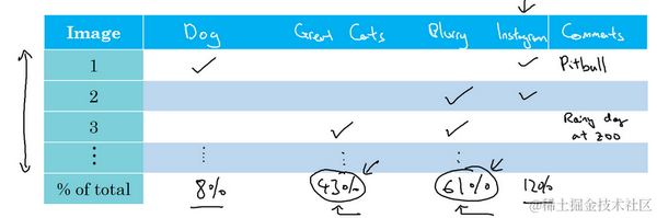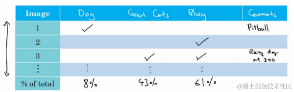 我会做的是建立这样一个表格,我通常用电子表格来做,但普通文本文件也可以。在最左边,人工过一遍你想分析的图像集,所以图像可能是从1到100,如果你观察100张图的话。电子表格的一列就对应你要评估的想法,所以狗的问题,猫科动物的问题,模糊图像的问题,我通常也在电子表格中留下空位来写评论。所以记住,在错误分析过程中,你就看看算法识别错误的开发集样本,如果你发现第一张识别错误的图片是狗图,那么我就在那里打个勾,为了帮我自己记住这些图片,有时我会在评论里注释,也许这是一张比特犬的图。如果第二张照片很模糊,也记一下。如果第三张是在下雨天动物园里的狮子,被识别成猫了,这是大型猫科动物,还有图片模糊,在评论部分写动物园下雨天,是雨天让图像模糊的之类的。最后,这组图像过了一遍之后,我可以统计这些算法(错误)的百分比,或者这里每个错误类型的百分比,有多少是狗,大猫或模糊这些错误类型。所以也许你检查的图像中8%是狗,可能43%属于大猫,61%属于模糊。这意味着扫过每一列,并统计那一列有多少百分比图像打了勾。