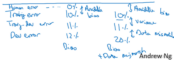 我们再来看几个样本,我会在下一行里写出来,因上面没空间了。所以训练误差、训练-开发误差、还有开发误差,我们说训练误差是10%,训练-开发误差是11%,开发误差为12%,要记住,人类水平对贝叶斯错误率的估计大概是0%,如果你得到了这种等级的表现,那就真的存在偏差问题了。存在可避免偏差问题,因为算法做的比人类水平差很多,所以这里的偏差真的很高。