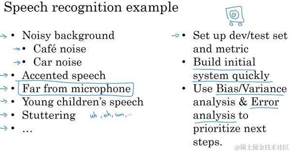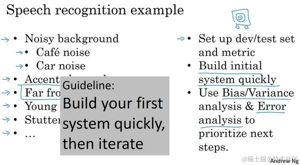 一般来说,对于几乎所有的机器学习程序可能会有50个不同的方向可以前进,并且每个方向都是相对合理的可以改善你的系统。但挑战在于,你如何选择一个方向集中精力处理。即使我已经在语音识别领域工作多年了,如果我要为一个新应用程序域构建新系统,我还是觉得很难不花时间去思考这个问题就直接选择方向。所以我建议你们,如果你想搭建全新的机器学习程序,就是快速搭好你的第一个系统,然后开始迭代。我的意思是我建议你快速设立开发集和测试集还有指标,这样就决定了你的目标所在,如果你的目标定错了,之后改也是可以的。但一定要设立某个目标,然后我建议你马上搭好一个机器学习系统原型,然后找到训练集,训练一下,看看效果,开始理解你的算法表现如何,在开发集测试集,你的评估指标上表现如何。当你建立第一个系统后,你就可以马上用到之前说的偏差方差分析,还有之前最后几个视频讨论的错误分析,来确定下一步优先做什么。特别是如果错误分析让你了解到大部分的错误的来源是说话人远离麦克风,这对语音识别构成特殊挑战,那么你就有很好的理由去集中精力研究这些技术,所谓远场语音识别的技术,这基本上就是处理说话人离麦克风很远的情况。