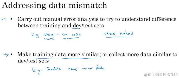 现在我知道这张幻灯片只给出了粗略的指南,列出一些你可以做的尝试,这不是一个系统化的过程,我想,这不能保证你一定能取得进展。但我发现这种人工见解,我们可以一起尝试收集更多和真正重要的场合相似的数据,这通常有助于解决很多问题。所以,如果你的目标是让训练数据更接近你的开发集,那么你可以怎么做呢?