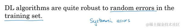 我这里先警告一下,深度学习算法对随机误差很健壮,但对系统性的错误就没那么健壮了。所以比如说,如果做标记的人一直把白色的狗标记成猫,那就成问题了。因为你的分类器学习之后,会把所有白色的狗都分类为猫。但随机错误或近似随机错误,对于大多数深度学习算法来说不成问题。
