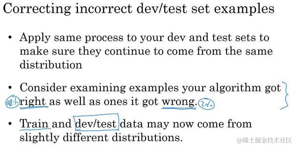其次,我强烈建议你要考虑同时检验算法判断正确和判断错误的样本,要检查算法出错的样本很容易,只需要看看那些样本是否需要修正,但还有可能有些样本算法判断正确,那些也需要修正。如果你只修正算法出错的样本,你对算法的偏差估计可能会变大,这会让你的算法有一点不公平的优势,我们就需要再次检查出错的样本,但也需要再次检查做对的样本,因为算法有可能因为运气好把某个东西判断对了。在那个特例里,修正那些标签可能会让算法从判断对变成判断错。这第二点不是很容易做,所以通常不会这么做。通常不会这么做的原因是,如果你的分类器很准确,那么判断错的次数比判断正确的次数要少得多。那么就有2%出错,98%都是对的,所以更容易检查2%数据上的标签,然而检查98%数据上的标签要花的时间长得多,所以通常不这么做,但也是要考虑到的。