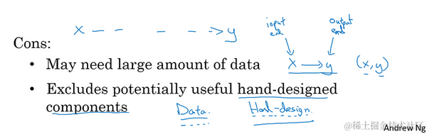 另一个缺点是,它排除了可能有用的手工设计组件。机器学习研究人员一般都很鄙视手工设计的东西,但如果你没有很多数据,你的学习算法就没办法从很小的训练集数据中获得洞察力。所以手工设计组件在这种情况,可能是把人类知识直接注入算法的途径,这总不是一件坏事。我觉得学习算法有两个主要的知识来源,一个是数据,另一个是你手工设计的任何东西,可能是组件,功能,或者其他东西。所以当你有大量数据时,手工设计的东西就不太重要了,但是当你没有太多的数据时,构造一个精心设计的系统,实际上可以将人类对这个问题的很多认识直接注入到问题里,进入算法里应该挺有帮助的。