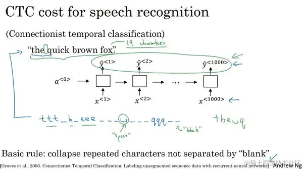 假设语音片段内容是某人说:"the quick brown fox",这时我们使用一个新的网络,结构像这个样子,这里输入 和输出 的数量都是一样的,因为我在这里画的,只是一个简单的单向RNN结构。然而在实际中,它有可能是双向的LSTM结构,或者双向的GIU结构,并且通常是很深的模型。但注意一下这里时间步的数量,它非常地大。在语音识别中,通常输入的时间步数量(the number of input time steps)要比输出的时间步的数量(the number of output time steps)多出很多。举个例子,比如你有一段10秒的音频,并且特征(features)是100赫兹的,即每秒有100个样本,于是这段10秒的音频片段就会有1000个输入,就是简单地用100赫兹乘上10秒。所以有1000个输入,但可能你的输出就没有1000个字母了,或者说没有1000个字符。这时要怎么办呢?CTC损失函数允许RNN生成这样的输出:ttt,这是一个特殊的字符,叫做空白符,我们这里用下划线表示,这句话开头的音可表示为h_eee_ _ _ ,然后这里可能有个空格,我们用这个来表示空格,之后是 _ _ _qqq__ , 这样的输出也被看做是正确的输出。下面这段输出对应的是"the q"。CTC损失函数的一个基本规则是将空白符之间的重复的字符折叠起来,再说清楚一些,我这里用下划线来表示这个特殊的空白符(a special blank character),它和空格(the space character)是不一样的。所以the和quick之间有一个空格符,所以我要输出一个空格,通过把用空白符所分割的重复的字符折叠起来,然后我们就可以把这段序列折叠成"the q"。这样一来你的神经网络因为有很多这种重复的字符,和很多插入在其中的空白符(blank characters),所以最后我们得到的文本会短上很多。于是这句"the quick brown fox"包括空格一共有19个字符,在这样的情况下,通过允许神经网络有重复的字符和插入空白符使得它能强制输出1000个字符,甚至你可以输出1000个 值来表示这段19个字符长的输出。这篇论文来自于Alex Grace以及刚才提到的那些人。我所参与的深度语音识别系统项目就使用这种思想来构建有效的语音识别系统。