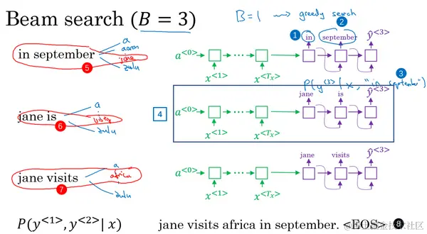 让我们快速解释一下集束搜索的下一步,前面说过前两个单词最可能的选择是“in September”和“jane is”以及“jane visits”,对于每一对单词我们应该保存起来,给定输入 ,即法语句子作为 的情况下, 和 的概率值和前面一样,现在我们考虑第三个单词是什么,可以是“in September a”,可以是“in September aaron”,一直到“in September zulu”。为了评估第三个单词可能的选择,我们用这个网络部分,第一单词是in(上图编号1所示),第二个单词是september(上图编号2所示),所以这个网络部分可以用来评估第三个单词的概率,在给定输入的法语句子 和给定的英语输出的前两个单词“in September”情况下(上图编号3所示)。对于第二个片段来说也一样,就像这样一样(上图编号4所示),对于“jane visits”也一样,然后集束搜索还是会挑选出针对前三个词的三个最可能的选择,可能是“in september jane”(上图编号5所示),“Jane is visiting”也很有可能(上图编号6所示),也很可能是“Jane visits Africa”(上图编号7所示)。