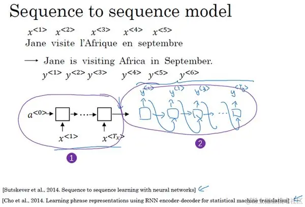 现在就开始吧,比如你想通过输入一个法语句子,比如这句 “Jane visite I'Afrique en septembre. ”,将它翻译成一个英语句子,“Jane is visiting Africa in September. ”。和之前一样,我们用 一直到 来表示输入的句子的单词,然后我们用 到 来表示输出的句子的单词,那么,如何训练出一个新的网络来输入序列 和输出序列 呢?