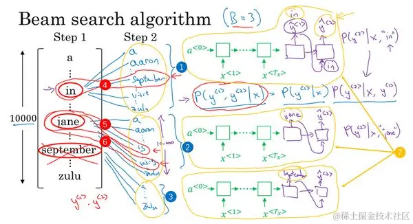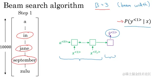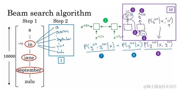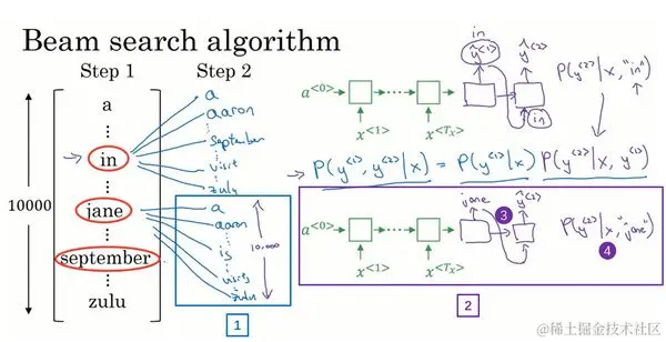 让我们看看集束搜索算法的第二步,已经选出了in、jane、september作为第一个单词三个最可能的选择,集束算法接下来会针对每个第一个单词考虑第二个单词是什么,单词in后面的第二个单词可能是a或者是aaron,我就是从词汇表里把这些词列了出来,或者是列表里某个位置,september,可能是列表里的 visit,一直到字母z,最后一个单词是zulu(下图编号1所示)。