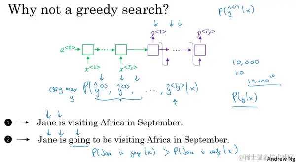 第一串(上图编号1所示)翻译明显比第二个(上图编号2所示)好,所以我们希望机器翻译模型会说第一个句子的 比第二个句子要高,第一个句子对于法语原文来说更好更简洁,虽然第二个也不错,但是有些啰嗦,里面有很多不重要的词。但如果贪心算法挑选出了"Jane is"作为前两个词,因为在英语中going更加常见,于是对于法语句子来说"Jane is going"相比"Jane is visiting"会有更高的概率作为法语的翻译,所以很有可能如果你仅仅根据前两个词来估计第三个词的可能性,得到的就是going,最终你会得到一个欠佳的句子,在 模型中这不是一个最好的选择。