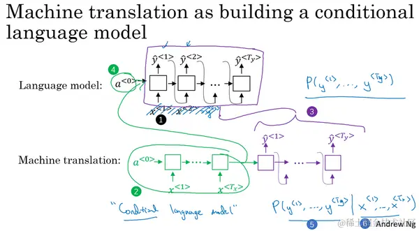 你可以把机器翻译想成是建立一个条件语言模型,在语言模型中上方是一个我们在第一周所建立的模型,这个模型可以让你能够估计句子的可能性,这就是语言模型所做的事情。你也可以将它用于生成一个新的句子,如果你在图上的该处(下图编号1所示),有 和 ,那么在该例中 ,但是 、 等在这里并不重要。为了让图片看起来更简洁,我把它们先抹去,可以理解为 是一个全为0的向量,然后 、 等都等于之前所生成的输出,这就是所说的语言模型。