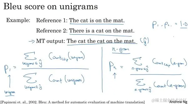 现在我们将它公式化。基于我们在一元词组中学到的内容,我们将改良后的一元词组精确度定义为 , 代表的是精确度。这里的下标1的意思是一元词组。不过它定义为一元词组之和,也就是对机器翻译结果中所有单词求和,MT 输出就是 ,Countclip(unigram)。除以机器翻译输出中的一元词组出现次数之和。因此这个就是最终结果应该是两页幻灯片前得到的2/7。这里的1指代的是一元词组,意思是我们在考虑单独的词,你也可以定义 为 元词组精确度,用n-gram替代掉一元词组。所以这就是机器翻译输出中的 元词组的countclip之和除以 元词组的出现次数之和。因此这些精确度或说是这些改良后的精确度得分评估的是一元词组或是二元词组。就是我们前页幻灯片中做的,或者是三元词组,也就是由三个词组成的,甚至是 取更大数值的 元词组。这个方法都能够让你衡量机器翻译输出中与参考相似重复的程度。另外,你能够确信如果机器翻译输出与参考1或是参考2完全一致的话,那么所有的这些 、 等等的值,都会等于1.0。为了得到改良后的1.0的精确度,只要你的输出与参考之一完全相同就能满足,不过有时即使输出结果并不完全与参考相同,这也是有可能实现的。你可以将它们以另一种方式组合,但愿仍能得到不错的翻译结果。