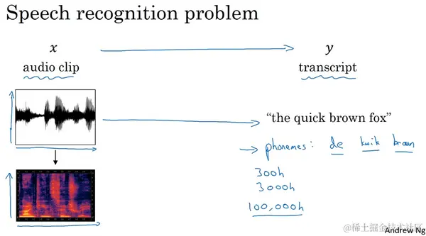 什么是语音视频问题呢?现在你有一个音频片段 (an audio clip,x),你的任务是自动地生成文本 。现在有一个音频片段,画出来是这样,该图的横轴是时间。一个麦克风的作用是测量出微小的气压变化,现在你之所以能听到我的声音,是因为你的耳朵能够探测到这些微小的气压变化,它可能是由你的扬声器或者耳机产生的,也就是像图上这样的音频片段,气压随着时间而变化。假如这个我说的音频片段的内容是:"the quick brown fox"(敏捷的棕色狐狸),这时我们希望一个语音识别算法(a speech recognition algorithm),通过输入这段音频,然后输出音频的文本内容。考虑到人的耳朵并不会处理声音的原始波形,而是通过一种特殊的物理结构来测量这些,不同频率和强度的声波。音频数据的常见预处理步骤,就是运行这个原始的音频片段,然后生成一个声谱图(a spectrogram),就像这样。同样地,横轴是时间,纵轴是声音的频率(frequencies),而图中不同的颜色,显示了声波能量的大小(the amount of energy),也就是在不同的时间和频率上这些声音有多大。通过这样的声谱图,或者你可能还听过人们谈到过伪空白输出(the false blank outputs),也经常应用于预处理步骤,也就是在音频被输入到学习算法之前,而人耳所做的计算和这个预处理过程非常相似。语音识别方面,最令人振奋的趋势之一就是曾经有一段时间,语音识别系统是用音位(phonemes)来构建的,也就是人工设计的基本单元(hand-engineered basic units of cells),如果用音位来表示"the quick brown fox",我这里稍微简化一些,"the"含有"th"和"e"的音,而"quick"有"k" "w" "i" "k"的音,语音学家过去把这些音作为声音的基本单元写下来,把这些语音分解成这些基本的声音单元,而"brown"不是一个很正式的音位,因为它的音写起来比较复杂,不过语音学家(linguists)们认为用这些基本的音位单元(basic units of sound called phonemes)来表示音频(audio),是做语音识别最好的办法。不过在end-to-end模型中,我们发现这种音位表示法(phonemes representations)已经不再必要了,而是可以构建一个系统,通过向系统中输入音频片段(audio clip),然后直接输出音频的文本(a transcript),而不需要使用这种人工设计的表示方法。使这种方法成为可能的一件事就是用一个很大的数据集,所以语音识别的研究数据集可能长达300个小时,在学术界,甚至3000小时的文本音频数据集,都被认为是合理的大小。大量的研究,大量的论文所使用的数据集中,有几千种不同的声音,而且,最好的商业系统现在已经训练了超过1万个小时的数据,甚至10万个小时,并且它还会继续变得更大。在文本音频数据集中(Transcribe audio data sets)同时包含 和 ,通过深度学习算法大大推进了语音识别的进程。那么,如何建立一个语音识别系统呢?