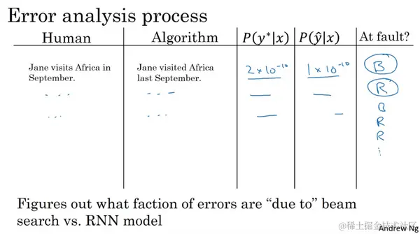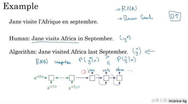 我们来用这个例子说明:“Jane visite l'Afrique en septembre”。假如说,在你的机器翻译的dev集中,也就是开发集(development set),人工是这样翻译的: Jane visits Africa in September,我会将这个标记为 。这是一个十分不错的人工翻译结果,不过假如说,当你在已经完成学习的RNN模型,也就是已完成学习的翻译模型中运行束搜索算法时,它输出了这个翻译结果:Jane visited Africa last September,我们将它标记为 。这是一个十分糟糕的翻译,它实际上改变了句子的原意,因此这不是个好翻译。