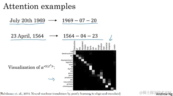 因为机器翻译是一个非常复杂的问题,在之前的练习中,你应用了注意力,在日期标准化的问题(the date normalization problem)上面,问题输入了像这样的一个日期,这个日期实际上是阿波罗登月的日期,把它标准化成标准的形式,或者这样的日期。用一个序列的神经网络,即序列模型去标准化到这样的形式,这个日期实际上是威廉·莎士比亚的生日。一般认为是这个日期正如你之前联系中见到的,你可以训练一个神经网络,输入任何形式的日期,生成标准化的日期形式。其他可以做的有意思的事情是看看可视化的注意力权重(the visualizations of the attention weights)。这个一个机器翻译的例子,这里被画上了不同的颜色,不同注意力权重的大小,我不想在这上面花太多时间,但是你可以发现,对应的输入输出词,你会发现注意力权重,会变高,因此这显示了当它生成特定的输出词时通常会花注意力在输入的正确的词上面,包括学习花注意在哪。在注意力模型中,使用反向传播时, 什么时候学习完成。