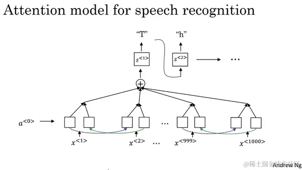 在上一节视频中,我们谈到了注意力模型,所以,一件你能做的事就是在横轴上,也就是在输入音频的不同时间帧上,你可以用一个注意力模型,来输出文本描述,如"the quick brown fox",或者其他语音内容。