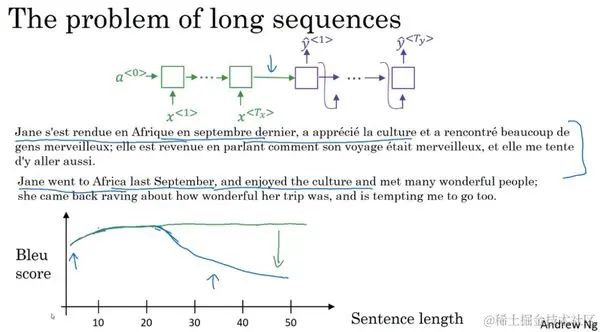 像这样给定一个很长的法语句子,在你的神经网络中,这个绿色的编码器要做的就是读整个句子,然后记忆整个句子,再在感知机中传递(to read in the whole sentence and then memorize the whole sentences and store it in the activations conveyed her)。而对于这个紫色的神经网络,即解码网络(the decoder network)将生成英文翻译,Jane去年九月去了非洲,非常享受非洲文化,遇到了很多奇妙的人,她回来就嚷嚷道,她经历了一个多棒的旅行,并邀请我也一起去。人工翻译并不会通过读整个法语句子,再记忆里面的东西,然后从零开始,机械式地翻译成一个英语句子。而人工翻译,首先会做的可能是先翻译出句子的部分,再看下一部分,并翻译这一部分。看一部分,翻译一部分,一直这样下去。你会通过句子,一点一点地翻译,因为记忆整个的像这样的的句子是非常困难的。你在下面这个编码解码结构中,会看到它对于短句子效果非常好,于是它会有一个相对高的Bleu分(Bleu score),但是对于长句子而言,比如说大于30或者40词的句子,它的表现就会变差。Bleu评分看起来就会像是这样,随着单词数量变化,短的句子会难以翻译,因为很难得到所有词。对于长的句子,效果也不好,因为在神经网络中,记忆非常长句子是非常困难的。在这个和下个视频中,你会见识到注意力模型,它翻译得很像人类,一次翻译句子的一部分。而且有了注意力模型,机器翻译系统的表现会像这个一样,因为翻译只会翻译句子的一部分,你不会看到这个有一个巨大的下倾(huge dip),这个下倾实际上衡量了神经网络记忆一个长句子的能力,这是我们不希望神经网络去做的事情。在这个视频中,我想要给你们注意力机制运行的一些直观的东西。然后在下个视频中,完善细节。