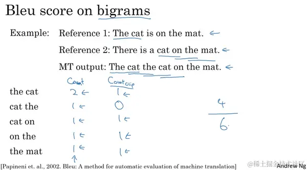 到目前为止,我们都只是关注单独的单词,在BLEU得分中,你不想仅仅考虑单个的单词,你也许也想考虑成对的单词,我们定义一下二元词组(bigrams)的BLEU得分。bigram的意思就是相邻的两个单词。现在我们来看看怎样用二元词组来定义BLEU得分,并且这仅仅只是最终的BLEU得分的一部分。我们会考虑一元词组(unigrams)也就是单个单词以及二元词组(bigrams),即成对的词,同时也许会有更长的单词序列,比如说三元词组(trigrams)。意思是三个挨在一起的词。我们继续刚才的例子,还是前面出现过的参考1和2,不过现在我们假定机器翻译输出了稍微好一点的翻译:The cat the cat on the mat,仍然不是一个好的翻译,不过也许比上一个好一些。这里,可能的二元词组有the cat ,忽略大小写,接着是cat the, 这是另一个二元词组,然后又是the cat。不过我已经有了,所以我们跳过它,然后下一个是cat on,然后是on the,再然后是the mat。所以这些就是机器翻译中的二元词组。好,我们来数一数每个二元词组出现了多少次。the cat出现了两次 ,cat the出现了一次,剩下的都只出现了一次。最后 ,我们来定义一下截取计数(the clipped count)。也就是Count_clip。为了定义它,我们以这列的值为基础,但是给算法设置得分上限,上限值为二元词组出现在参考1或2中的最大次数。the cat在两个参考中最多出现一次,所以我将截取它的计数为1。cat the它并没有出现在参考1和参考2中,所以我将它截取为0。cat on ,好,它出现了一次,我们就记1分。on the出现一次就记1分,the mat出现了一次,所以这些就是截取完的计数(the clipped counts)。我们把所有的这些计数都截取了一遍,实际上就是将它们降低使之不大于二元词组出现在参考中的次数。最后,修改后的二元词组的精确度就是count_clip之和。因此那就是4除以二元词组的总个数,也就是6。因此是4/6也就是2/3为二元词组改良后的精确度。