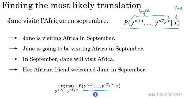 现在,假如你想真正地通过模型将法语翻译成英文,通过输入的法语句子模型将会告诉你各种英文翻译所对应的可能性。 在这里是法语句子"Jane visite l'Afrique en septembre. ",而它将告诉你不同的英语翻译所对应的概率。显然你不想让它随机地进行输出,如果你从这个分布中进行取样得到 ,可能取样一次就能得到很好的翻译,"Jane is visiting Africa in September. "。但是你可能也会得到一个截然不同的翻译,"Jane is going to be visiting Africa in September. ",这句话听起来有些笨拙,但它不是一个糟糕的翻译,只是不是最好的而已。有时你也会偶然地得到这样的翻译,"In September, Jane will visit Africa. ",或者有时候你还会得到一个很糟糕的翻译,"Her African friend welcomed Jane in September. "。所以当你使用这个模型来进行机器翻译时,你并不是从得到的分布中进行随机取样,而是你要找到一个英语句子 (上图编号1所示),使得条件概率最大化。所以在开发机器翻译系统时,你需要做的一件事就是想出一个算法,用来找出合适的 值,使得该项最大化,而解决这种问题最通用的算法就是束搜索(Beam Search),你将会在下节课见到它。