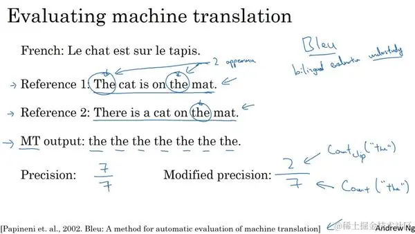 假如给你一个法语句子:Le chat est sur le tapis,然后给你一个这个句子的人工翻译作参考:The cat is on the mat。不过有多种相当不错的翻译。所以一个不同的人,也许会将其翻译为:There is a cat on the mat,同时,实际上这两个都是很好的,都准确地翻译了这个法语句子。BLEU得分做的就是,给定一个机器生成的翻译,它能够自动地计算一个分数来衡量机器翻译的好坏。直觉告诉我们,只要这个机器生成的翻译与任何一个人工翻译的结果足够接近,那么它就会得到一个高的BLEU分数。顺便提一下BLEU代表bilingual evaluation understudy (双语评估替补)。在戏剧界,侯补演员(understudy)学习资深的演员的角色,这样在必要的时候,他们就能够接替这些资深演员。而BLEU的初衷是相对于请评估员(ask human evaluators),人工评估机器翻译系统(the machine translation system),BLEU得分就相当于一个侯补者,它可以代替人类来评估机器翻译的每一个输出结果。BLEU得分是由Kishore Papineni, Salim Roukos,Todd Ward和Wei-Jing Zhu发表的这篇论文十分有影响力并且实际上也是一篇很好读的文章。所以如果有时间的话,我推荐你读一下。BLEU得分背后的理念是观察机器生成的翻译,然后看生成的词是否出现在少一个人工翻译参考之中。因此这些人工翻译的参考会包含在开发集或是测试集中。