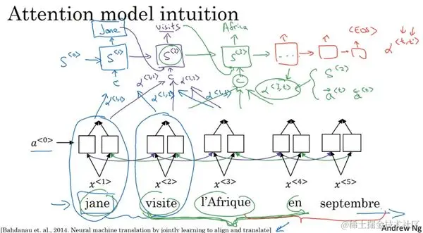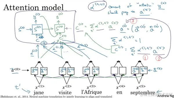 让我们用一个短句举例说明一下,即使这些思想可能是应用于更长的句子。但是用短句来举例说明,讲解这些思想会更简单。我们有一个很平常的句子:(法语)Jane visite l'Afrique en Septembre。假定我们使用RNN,在这个情况中,我们将使用一个双向的RNN(a bidirectional RNN),为了计算每个输入单词的的特征集(set of features),你必须要理解输出 到 一直到 的双向RNN。但是我们并不是只翻译一个单词,让我们先去掉上面的 ,就用双向的RNN。我们要对单词做的就是,对于句子里的每五个单词,计算一个句子中单词的特征集,也有可能是周围的词,让我们试试,生成英文翻译。我们将使用另一个RNN生成英文翻译,这是我平时用的RNN记号。我不用 来表示感知机(the activation),这是为了避免和这里的感知机(the activations)混淆。我会用另一个不同的记号,我会用 来表示RNN的隐藏状态(the hidden state in this RNN),不用 ,而是用 。我们希望在这个模型里第一个生成的单词将会是Jane,为了生成Jane visits Africa in September。于是等式就是,当你尝试生成第一个词,即输出,那么我们应该看输入的法语句子的哪个部分?似乎你应该先看第一个单词,或者它附近的词。但是你别看太远了,比如说看到句尾去了。所以注意力模型就会计算注意力权重(a set of attention weights),我们将用 来表示当你生成第一个词时你应该放多少注意力在这个第一块信息处。然后我们算第二个,这个叫注意力权重, 它告诉我们当你尝试去计算第一个词Jane时,我们应该花多少注意力在输入的第二个词上面。同理这里是 ,接下去也同理。这些将会告诉我们,我们应该花多少注意力在记号为 的内容上。这就是RNN的一个单元,如何尝试生成第一个词的,这是RNN的其中一步,我们将会在下个视频中讲解细节。对于RNN的第二步,我们将有一个新的隐藏状态 ,我们也会用一个新的注意力权值集**(a new set of the attention weights**),我们将用 来告诉我们什么时候生成第二个词, 那么visits就会是第二个标签了(the ground trip label)。我们应该花多少注意力在输入的第一个法语词上。然后同理 ,接下去也同理,我们应该花多少注意力在visite词上,我们应该花多少注意在词l'Afique上面。当然我们第一个生成的词Jane也会输入到这里,于是我们就有了需要花注意力的上下文。第二步,这也是个输入,然后会一起生成第二个词,这会让我们来到第三步 ,这是输入,我们再有上下文C,它取决于在不同的时间集(time sets),上面的 。这个告诉了我们我们要花注意力在不同的法语的输入词上面。然后同理。有些事情我还没说清楚,但是在下个视频中,我会讲解一些细节,比如如何准确定义上下文,还有第三个词的上下文,是否真的需要去注意句子中的周围的词。这里要用到的公式以及如何计算这些注意力权重(these attention weights),将会在下个视频中讲解到。在下个视频中你会看到 ,即当你尝试去生成第三个词,应该是l'Afique,就得到了右边这个输出,这个RNN步骤应该要花注意力在 时的法语词上,这取决于在 时的双向RNN的激活值。那么它应该是取决于第四个激活值,它会取决于上一步的状态,它会取决于 。然后这些一起影响你应该花多少注意在输入的法语句子的某个词上面。我们会在下个视频中讲解这些细节。但是直观来想就是RNN向前进一次生成一个词,在每一步直到最终生成可能是**<EOS>**。这些是注意力权重,即 告诉你,当你尝试生成第 个英文词,它应该花多少注意力在第 个法语词上面。当生成一个特定的英文词时,这允许它在每个时间步去看周围词距内的法语词要花多少注意力。