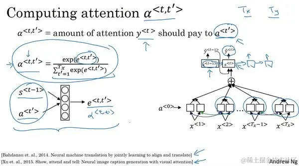 回忆一下 ,是你应该花费在 上的注意力的数量,当你尝试去生成第 个输出的翻译词,让我们先把式子写下来,再讨论它是怎么来的。这个式子你可以用来计算 ,在此之前我们要先计算 ,关键要用softmax,来确保这些权重加起来等于1。如果你对 求和,比如每一个固定的 值,这些加起来等于1。如果你对 求和,然后优先使用softmax,确保这些值加起来等于1。