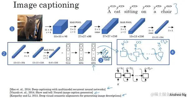 方法如下,在之前的卷积网络课程中,你已经知道了如何将图片输入到卷积神经网络中,比如一个预训练的AlexNet结构(上图编号2方框所示),然后让其学习图片的编码,或者学习图片的一系列特征。现在幻灯片所展示的就是AlexNet结构,我们去掉最后的softmax单元(上图编号3所示),这个预训练的AlexNet结构会给你一个4096维的特征向量,向量表示的就是这只猫的图片,所以这个预训练网络可以是图像的编码网络。现在你得到了一个4096维的向量来表示这张图片,接着你可以把这个向量输入到RNN中(上图编号4方框所示),RNN要做的就是生成图像的描述,每次生成一个单词,这和我们在之前将法语译为英语的机器翻译中看到的结构很像,现在你输入一个描述输入的特征向量,然后让网络生成一个输出序列,或者说一个一个地输出单词序列。