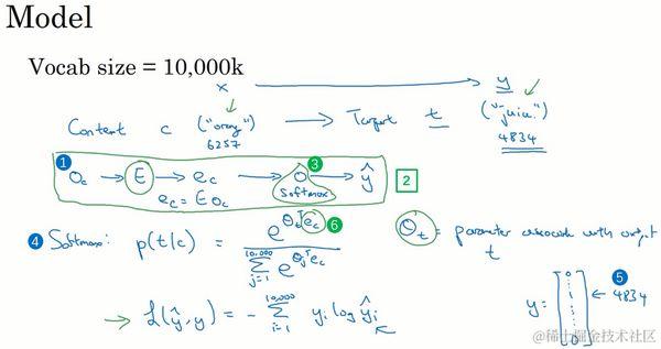为了表示输入,比如单词orange,你可以先从one-hot向量开始,我们将其写作 ,这就是上下文词的one-hot向量(上图编号1所示)。然后和你在上节视频中看到的类似,你可以拿嵌入矩阵 乘以向量 ,然后得到了输入的上下文词的嵌入向量,于是这里 。在这个神经网络中(上图编号2所示),我们将把向量 喂入一个softmax单元。我通常把softmax单元画成神经网络中的一个节点(上图编号3所示),这不是字母O,而是softmax单元,softmax单元要做的就是输出 。然后我们再写出模型的细节,这是softmax模型(上图编号4所示),预测不同目标词的概率: