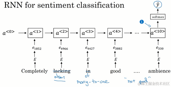 我们有一个更加复杂的模型,不用简单的把所有的词嵌入都加起来,我们用一个RNN来做情感分类。我们这样做,首先取这条评论,"Completely lacking in good taste, good service, and good ambiance. ",找出每一个one-hot向量,这里我跳过去每一个one-hot向量的表示。用每一个one-hot向量乘以词嵌入矩阵 ,得到词嵌入表达 ,然后把它们送进RNN里。RNN的工作就是在最后一步(上图编号1所示)计算一个特征表示,用来预测 ,这是一个多对一的网络结构的例子,我们之前已经见过了。有了这样的算法,考虑词的顺序效果就更好了,它就能意识到"things are lacking in good taste",这是个负面的评价,“not good”也是一个负面的评价。而不像原来的算法一样,只是把所有的加在一起得到一个大的向量,根本意识不到“not good”和 “good”不是一个意思,"lacking in good taste"也是如此,等等。