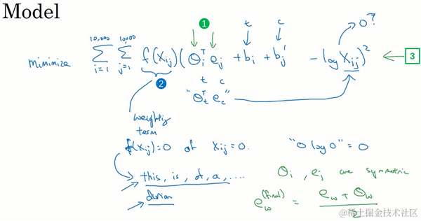 其中 ,想一下 和 与 和 的功能一样,因此这就和你之前看的有些类似了,即 。同时对于这个( ,下图编号1所示)来说,你想要知道的是告诉你这两个单词之间有多少联系, 和 之间有多紧密, 和 之间联系程度如何,换句话说就是他们同时出现的频率是多少,这是由这个 影响的。然后,我们要做的是解决参数 和 的问题,然后准备用梯度下降来最小化上面的公式,你只想要学习一些向量,这样他们的输出能够对这两个单词同时出现的频率进行良好的预测。