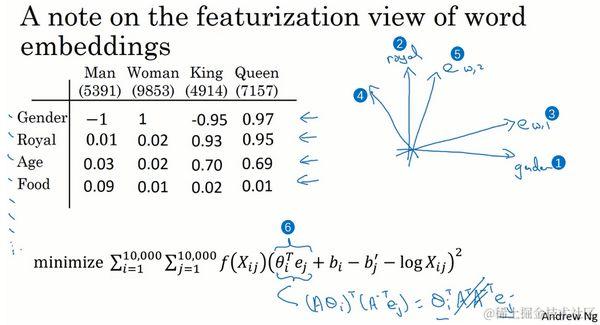 这就是GloVe算法的内容,我认为这个算法的一个疑惑之处是如果你看着这个等式,它实在是太简单了,对吧?仅仅是最小化,像这样的一个二次代价函数(上图编号3所示)是怎么能够让你学习有意义的词嵌入的呢?但是结果证明它确实有效,发明者们发明这个算法的过程是他们以历史上更为复杂的算法,像是newer language模型,以及之后的Word2Vec、Skip-Gram模型等等为基础,同时希望能够简化所有之前的算法才发明的。