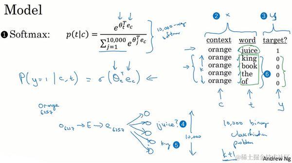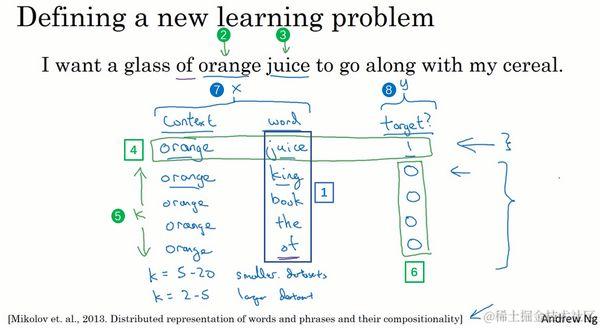 接下来我们将构造一个监督学习问题,其中学习算法输入 ,输入这对词(上图编号7所示),要去预测目标的标签(上图编号8所示),即预测输出 。因此问题就是给定一对词,像orange和juice,你觉得它们会一起出现么?你觉得这两个词是通过对靠近的两个词采样获得的吗?或者你觉得我是分别在文本和字典中随机选取得到的?这个算法就是要分辨这两种不同的采样方式,这就是如何生成训练集的方法。