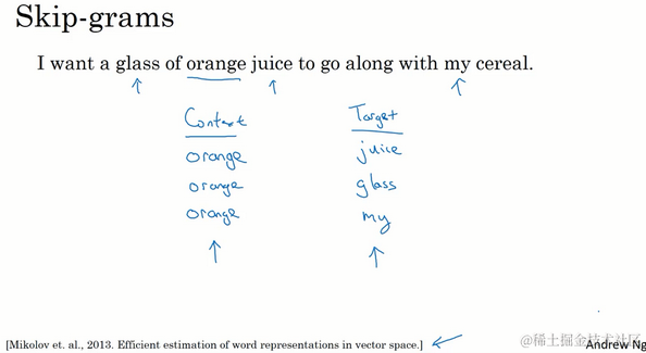 假设在训练集中给定了一个这样的句子:“I want a glass of orange juice to go along with my cereal. ”,在Skip-Gram模型中,我们要做的是抽取上下文和目标词配对,来构造一个监督学习问题。上下文不一定总是目标单词之前离得最近的四个单词,或最近的 个单词。我们要的做的是随机选一个词作为上下文词,比如选orange这个词,然后我们要做的是随机在一定词距内选另一个词,比如在上下文词前后5个词内或者前后10个词内,我们就在这个范围内选择目标词。可能你正好选到了juice作为目标词,正好是下一个词(表示orange的下一个词),也有可能你选到了前面第二个词,所以另一种配对目标词可以是glass,还可能正好选到了单词my作为目标词。