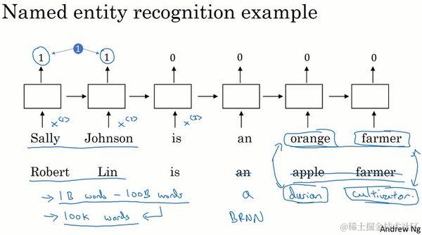 我们从一个例子开始,我们继续用命名实体识别的例子,如果你要找出人名,假如有一个句子:“Sally Johnson is an orange farmer. ”(Sally Johnson是一个种橙子的农民),你会发现Sally Johnson就是一个人名,所以这里的输出为1。之所以能确定Sally Johnson是一个人名而不是一个公司名,是因为你知道种橙子的农民一定是一个人,前面我们已经讨论过用one-hot来表示这些单词, , 等等。