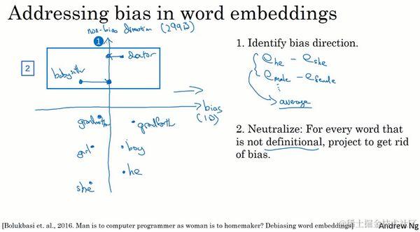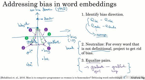最后,你需要平衡的词对的数实际上是很小的,至少对于性别歧视这个例子来说,用手都能够数出来你需要平衡的大部分词对。完整的算法会比我在这里展示的更复杂一些,你可以去看一下这篇论文了解详细内容,你也可以通过编程作业来练习一下这些想法。
