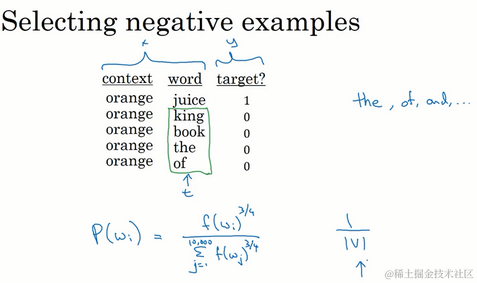 这个算法有一个重要的细节就是如何选取负样本,即在选取了上下文词orange之后,你如何对这些词进行采样生成负样本?一个办法是对中间的这些词进行采样,即候选的目标词,你可以根据其在语料中的经验频率进行采样,就是通过词出现的频率对其进行采样。但问题是这会导致你在like、the、of、and诸如此类的词上有很高的频率。另一个极端就是用1除以词汇表总词数,即 ,均匀且随机地抽取负样本,这对于英文单词的分布是非常没有代表性的。所以论文的作者Mikolov等人根据经验,他们发现这个经验值的效果最好,它位于这两个极端的采样方法之间,既不用经验频率,也就是实际观察到的英文文本的分布,也不用均匀分布,他们采用以下方式: