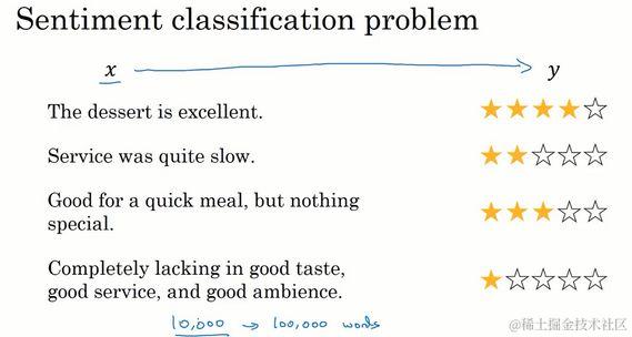 这是一个情感分类问题的一个例子(上图所示),输入 是一段文本,而输出 是你要预测的相应情感。比如说是一个餐馆评价的星级,