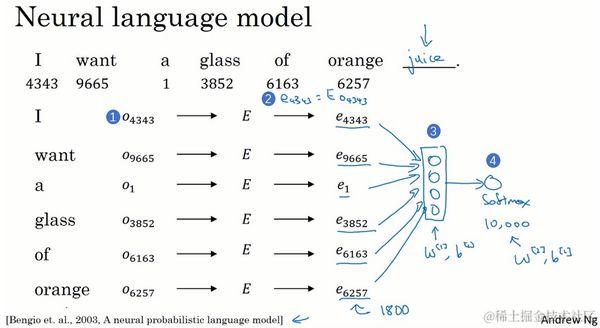 下面我将介绍如何建立神经网络来预测序列中的下一个单词,让我为这些词列一个表格,“I want a glass of orange”,我们从第一个词I开始,建立一个one-hot向量表示这个单词I。这是一个one-hot向量(上图编号1所示),在第4343个位置是1,它是一个10,000维的向量。然后要做的就是生成一个参数矩阵 ,然后用 乘以 ,得到嵌入向量 ,这一步意味着 是由矩阵 乘以one-hot向量得到的(上图编号2所示)。然后我们对其他的词也做相同的操作,单词want在第9665个,我们将 与这个one-hot向量( )相乘得到嵌入向量 。对其他单词也是一样,a是字典中的第一个词,因为a是第一个字母,由 得到 。同样地,其他单词也这样操作。